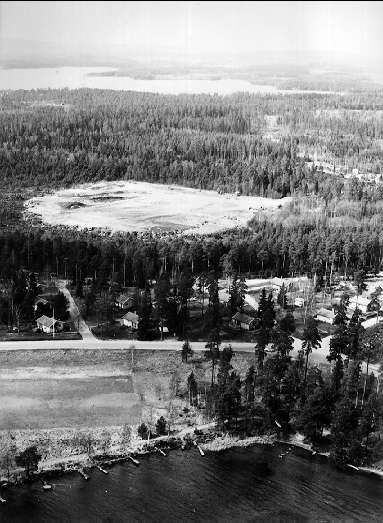 Flygfoto över soptippen i Norra skogen, Karlsborg. Samt del av bebyggelsen. Neg finns.
