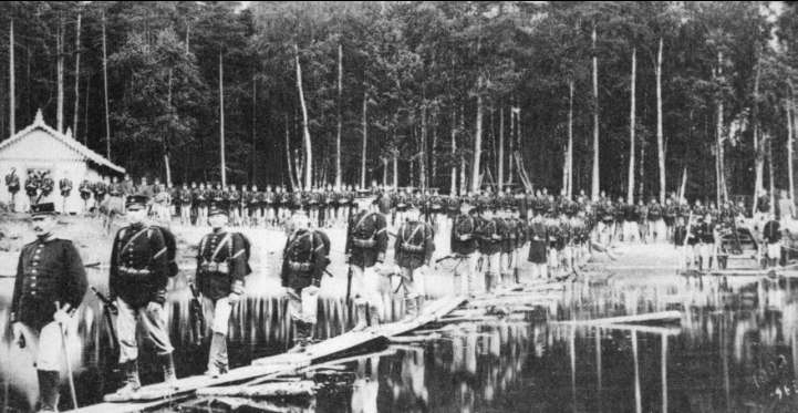 Från volontärskolans övningar år 1903. Marsch över en provisorisk lagd bro. Endast neg finns.