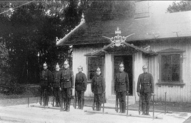 Fästningen. Högvakten vid fästningsporten. Vaktlokalen där vakter kontrollerade in- och utpasseringar till fästningen under krigsåren. Här år 1916.