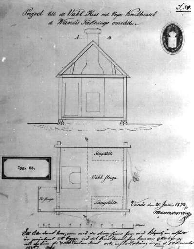 Projektritning till ett vakthus vid nya kruthuset på Wanäs fästningsområde.
