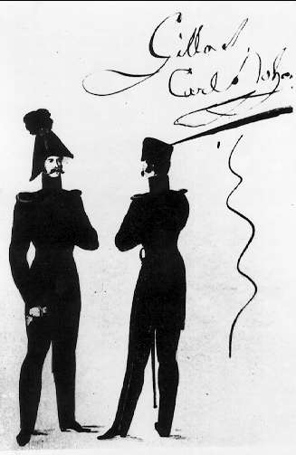 Uniform för officerare och underofficerare vid telegrafikåren. Godkänd av Carl XIV Johan 1837 - 39.