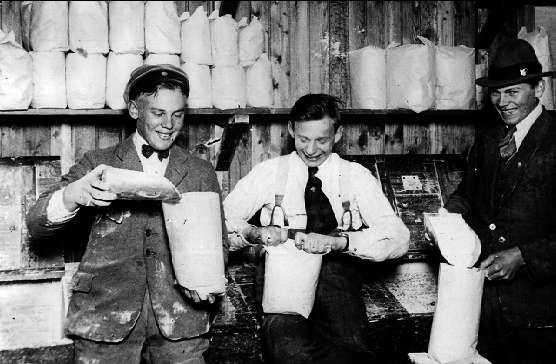 Interiör från Arvidssons speceriaffär vid fästningstorget år 1924, Karl-Otto Forsberg, Gösta Arvidsson och Gustav Ellenfors. Neg. finns.