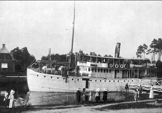 Parti från Göta kanal. Passagerarbåten Ceres passerar Rödesundsbron (rullbron) omkr 1900-talets början. Vykort. Neg finns.