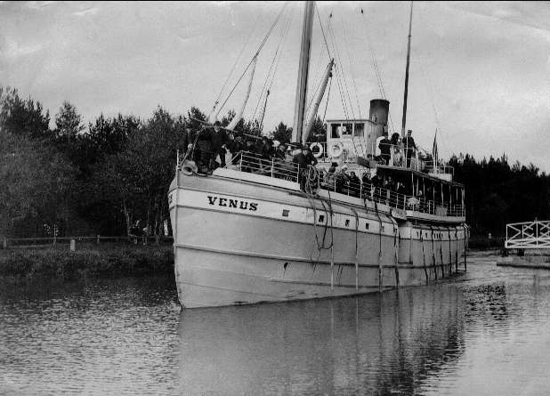 Parti från Göta kanal. Passagerarbåten Venus passerar Rödesundsbron (rullbron). Foto: Axel Sjöberg.