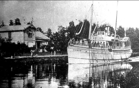 Rödesund. Parti från Göta kanal. Passagerarbåten Venus i Göta kanal. Grosshandlare Kindboms hus syns i bakgrunden.