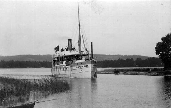 Rödesund. Parti från Göta kanal. Passagerarbåten Astrea på ingång i kanalen från Bottensjön. Neg. finns. Förstoring 25 x 40 cm.