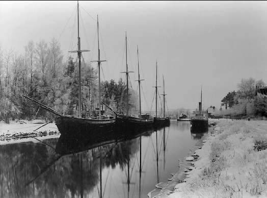 Rödesund, parti från Göta kanal, vinterliggare före år 1905. Neg och glasneg finns.