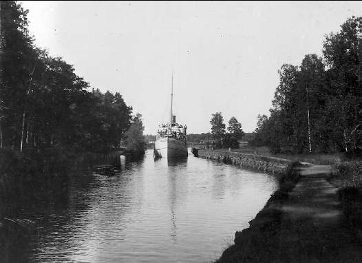 Göta kanal. Parti från Forsvik. Passagerarbåten Baltzar von Platen passerar. Förstoring 26 x 35 och 28 x 38 cm.