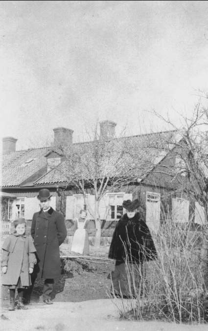 Kyrkoherde Göransson med fru och dotter Mona utanför gamla prästgården, norra skogen Karlsborg. Förstoring 45 x 30 cm finns. Neg finns.