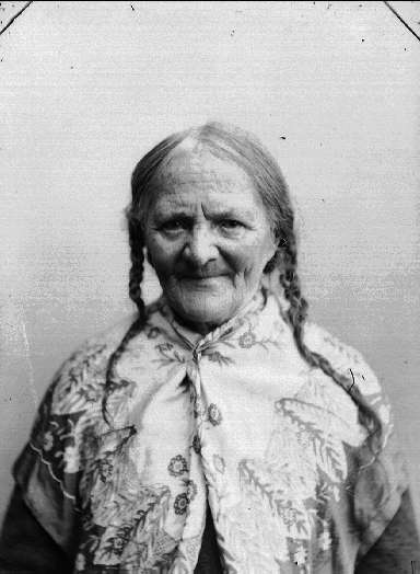 Dora Beata Beckman "Döva Beata", tvätterska, den sista kvinnan som bodde i fattigstugan i Rödesund, som låg där Konsum nu är beläget. Förstoring 38 x 26 cm. Neg och glasneg finns.