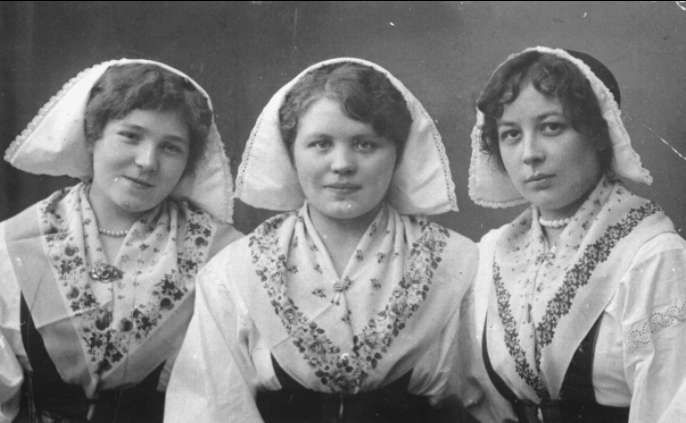 Dalkullor klädda i landskapsdräkt, Anna, Astrid och Maria år 1916. Förstoring 25 x 40 cm. Neg finns.