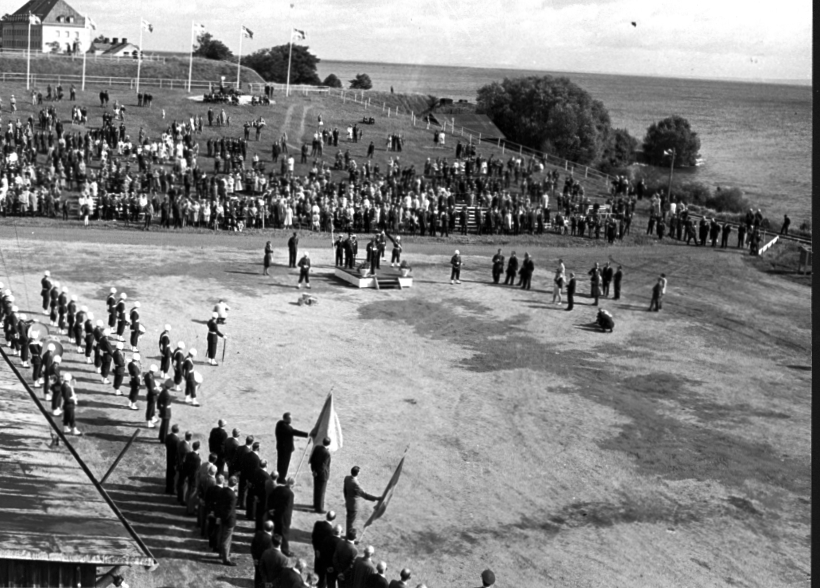 Karlsborg, Stabshallen nära Vätternstranden. Gustav VI Adolf hälsas välkommen till garnisonen. Albumet är en del av en donation från Karl-Axel Hansson, Karlsborg. Förteckning över hela donationen finns i albumet samt som World-dokument.