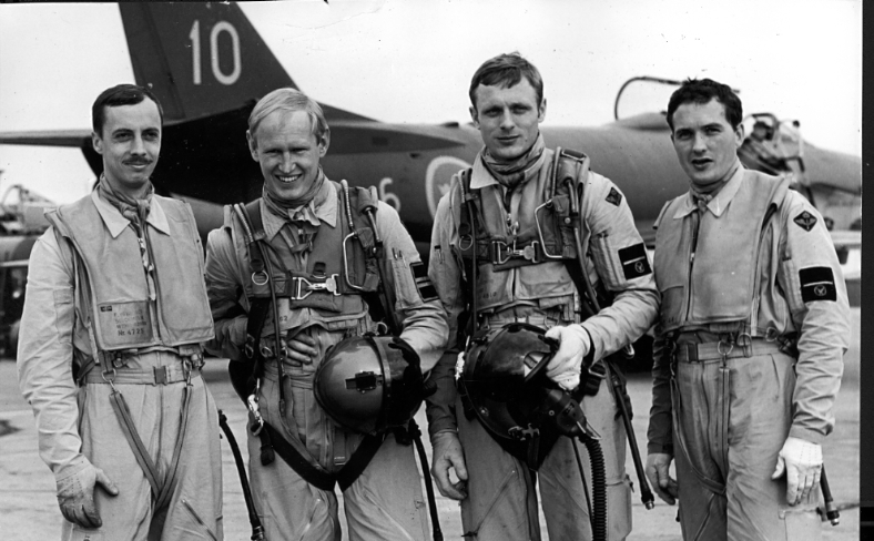 F6 Karlsborg. Flygdagen 1969. Uppvisningsgrupp. Från vänster: Andersson (Schyborger), Lundin, Gieryluck, Kristiansson. Albumet är en del av en donation från Karl-Axel Hansson, Karlsborg. Förteckning över hela donationen finns i albumet samt som Word-dokument.