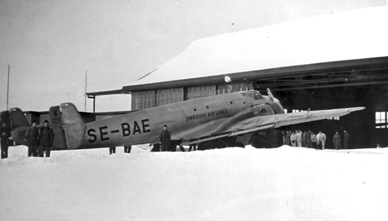 F6 Karlsborg 1940. JU86Z7 SE-BAE "Svalan" gästar flottiljen. Levererades i mars 1938 och var enkom för ABA:s räkning ombyggt som postflygplan. Användes på nattpostlinjen Stockholm-Malmö-Hannover fram till krigsutbrottet, då nattpostflygningarna måste inställas. I oktober 1940 inköptes planet av flygvapnet och blev transportflygplan under beteckningen Tp9. Här utanför 3. Divisionens hangar. Albumet är en del av en donation från Karl-Axel Hansson, Karlsborg. Förteckning över hela donationen finns i albumet samt som Word-dokument.
