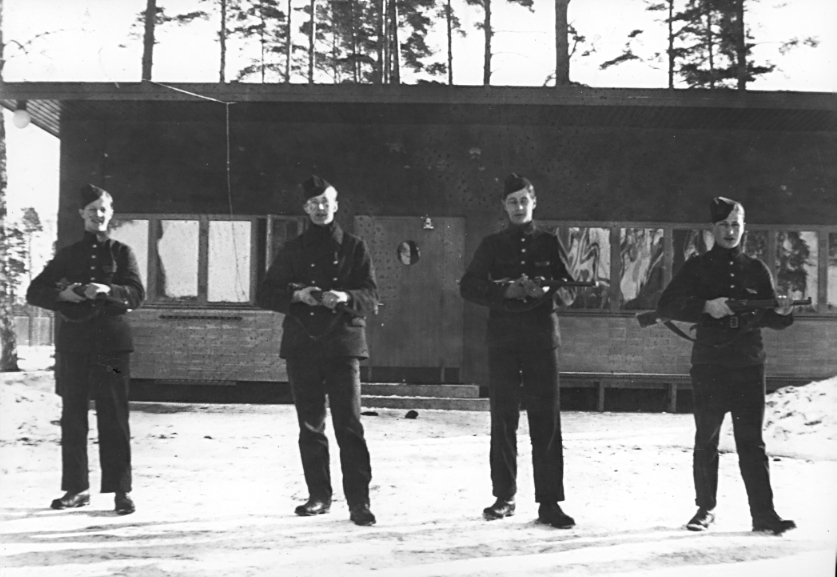 F6 Karlsborg 1940. Från vänster volontärerna 78 R.T. Lund, 87 I.R. Svedberg, 80 A. Eneström, 84 S.G. Hylander. I bakgrunden den nya vaktlokalen. Albumet är en del av en donation från Karl-Axel Hansson, Karlsborg. Förteckning över hela donationen finns i albumet, samt som Word-dokument.
