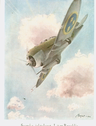 1940. Svenska jaktplanet J 9-Republic. Vykort från akvarell målad av Agne Högstedt. Förlag: Flygtidningen, Malmö. Albumet är en del av en donation från Karl-Axel Hansson, Karlsborg. Förteckning över hela donationen finns i albumet, samt som Word-dokument.