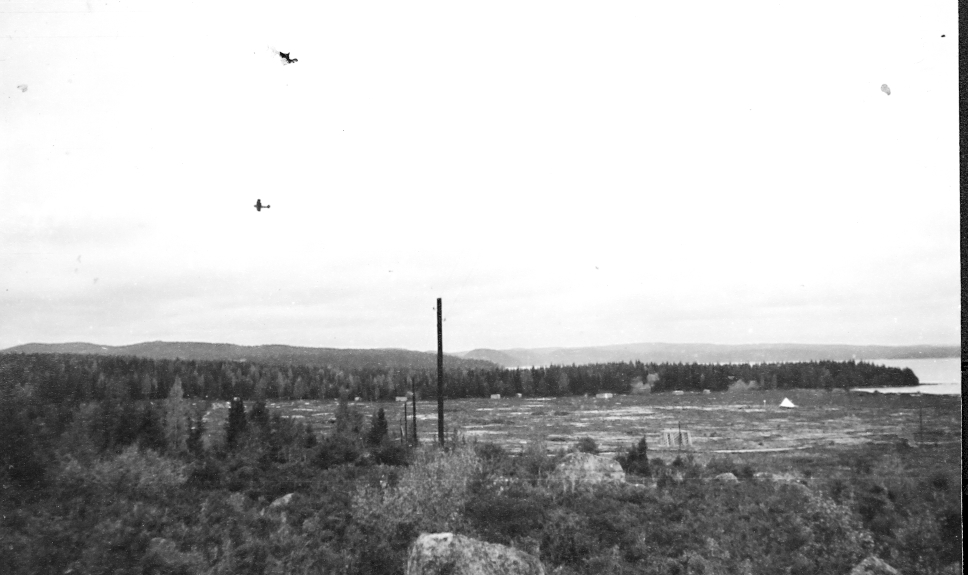 Titel: F6 Karlsborg 1940. Vy över bombfältet på Rissnäset under fällning av stridsladdade bomber den 1-2/10. Albumet är en del av en donation från Karl-Axel Hansson, Karlsborg. Förteckning över hela donationen finns i albumet, samt som Word-dokument.