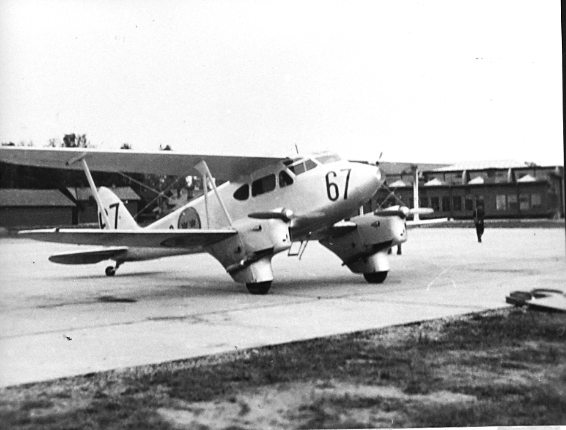 F6 Karlsborg 1940. Gästande De Havilland DH 90 "Dragon Fly". Tygverkstaden till höger. Albumet är en del av en donation från Karl-Axel Hansson, Karlsborg. Förteckning över hela donationen finns i albumet, samt som Word-dokument.