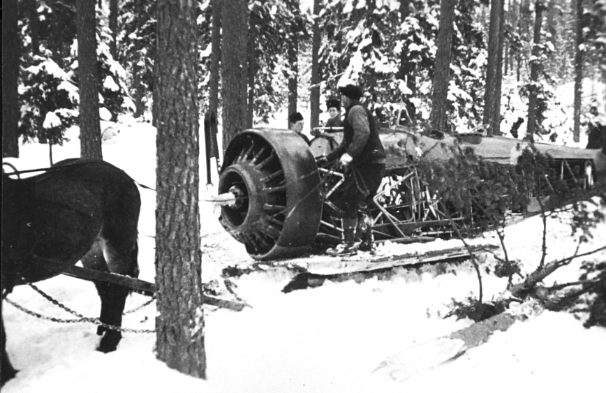 F6 Karlsborg 1941. Vinterövning i Luleå. Bärgning av flygplan B4 efter flygförare vpl. Korpral Perssons haveri. Tyghantverkare Dahlberg tjänstgjorde som chef för nedmonteringen för vidare transport. I mitten korpral 39 Börjesson. Albumet är en del av en donation från Karl-Axel Hansson, Karlsborg. Förteckning över hela donationen finns i albumet samt som Word-dokument.