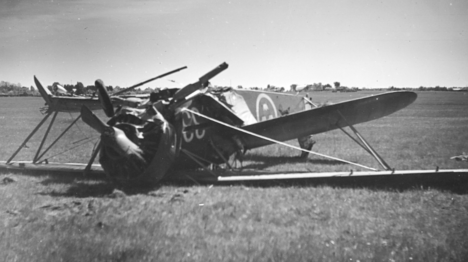F6 Karlsborg 9/6 1941. Haveri med B4 på F6-fältet. Vid landning kolliderade planet med ett träd omedelbart utanför fältgränsen, varvid planet tappade farten, vek sig och havererade. Flygning skedde via instrument under huv. Flygförare var reservoff.aspirant Björnhagen. Som säkerhetsförare off.aspirant Forsell. Besättningen skadades inte allvarligt. Albumet är en del av en donation från Karl-Axel Hansson, Karlsborg. Förteckning över hela donationen finns i albumet samt som Word-dokument.