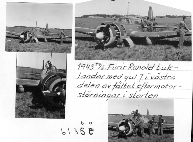 F6 Karlsborg 1945. Furir Runold buklandar 19/6 med gul J v västra hörnet avfältet efter motorstörningar i starten. Albumet är en del av en donation från Karl-Axel Hansson, Karlsborg. Förteckning över hela donationen finns i albumet samt som Word-dokument.