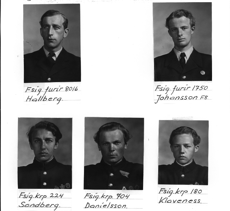 F6 Karlsborg 1947. GFSU-elever kategori flygsignalister vid första divisionen: Furir 8016 Hallberg, furir 1750 Johansson, korpral 224 Sandberg, korpral 704 Danielsson, korpral 180 Klaveness. Albumet är en del av en donation från Karl-Axel Hansson, Karlsborg. Förteckning över hela donationen finns i albumet samt som Word-dokument.