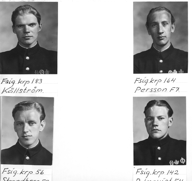 F6 Karlsborg 1947. GFSU-elever kategori flygsignalister vid tredje divisionen: Korpral 183 Källström, korpral 164 Persson (F7), korpral 56 Strandberg (F9), korpral 142 Palmquist (F11). Albumet är en del av en donation från Karl-Axel Hansson, Karlsborg. Förteckning över hela donationen finns i albumet samt som Word-dokument.