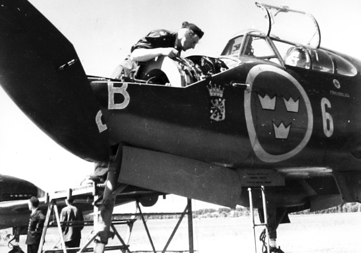 F6 Karlsborg 1952. Flygplan A21. Beväpningen i nosen bestod av 3 automatkanoner, en 20 mm och 2 12,7 mm. Flygtekniker Bror Peterson servar här beväpningen. Albumet är en del av en donation från Karl-Axel Hansson, Karlsborg. Förteckning över hela donationen finns i albumet samt som Word-dokument.