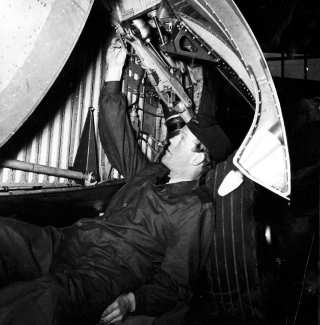 F6 Karlsborg 1953. Flottiljen omskolas till flygplan A29 "Tunnan". Flygtekniker Forsmark studerar höger huvudställ. Albumet är en del av en donation från Karl-Axel Hansson, Karlsborg. Förteckning över hela donationen finns i albumet samt som Word-dokument.