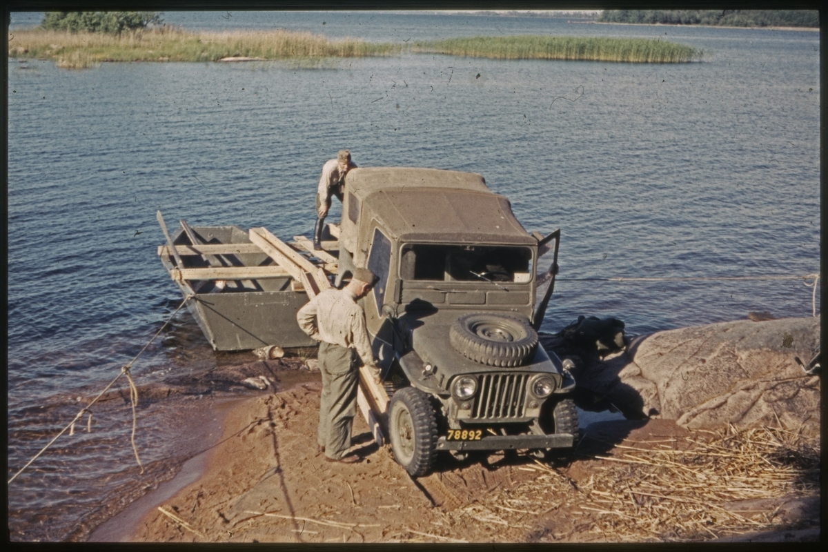 Signaltrupperna, S2 Karlsborg 1957. Jeep-färja demonstreras i samband med Jutan-övningar på Vänern.