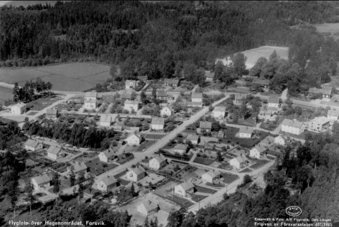 Flygfoto över Forsvik, Hagenområdet. Gåva av Eric Windelövs dödsbo, 2006. Förlag: Johansons pappershandel, Forsvik.