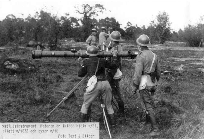 Luftvärnet. Avståndsinstrument. Mätaren är iklädd hjälm m/21, kolett m/1872 och byxor m/10.