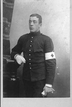 Porträtt av man i uniform med armbindel.