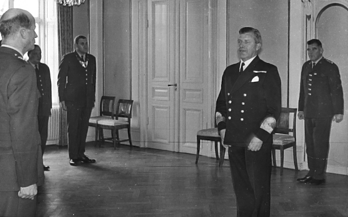 Avlämning till MB, Krokstedt i generalsalen Wanäs mäss. (60-talet?)