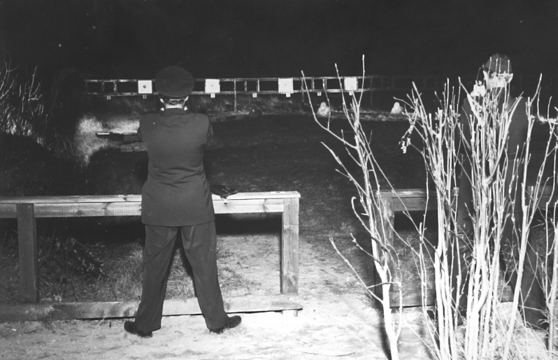 F6 Karlsborg. 1953-års krigsstig-träningsskjutning i mörker med pistol.