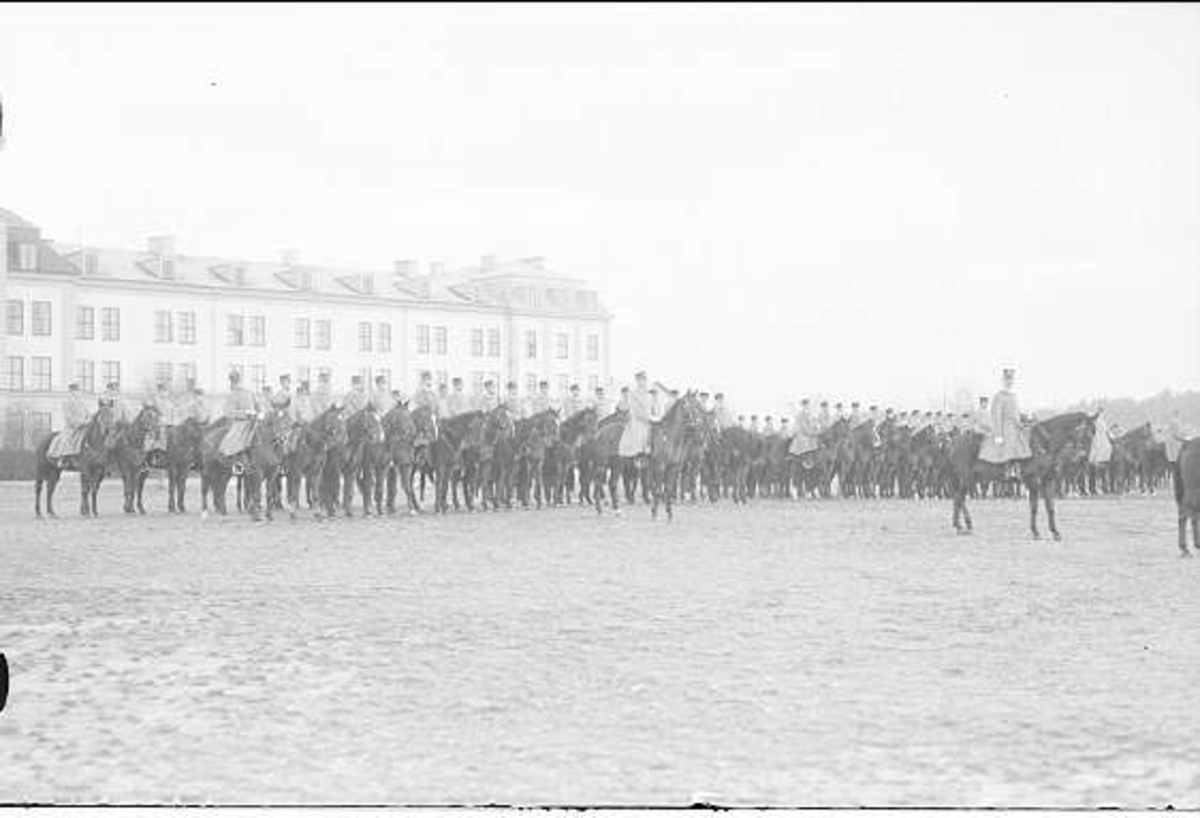 Avdelning till häst uppställd på fältet söder K3 kasern.
