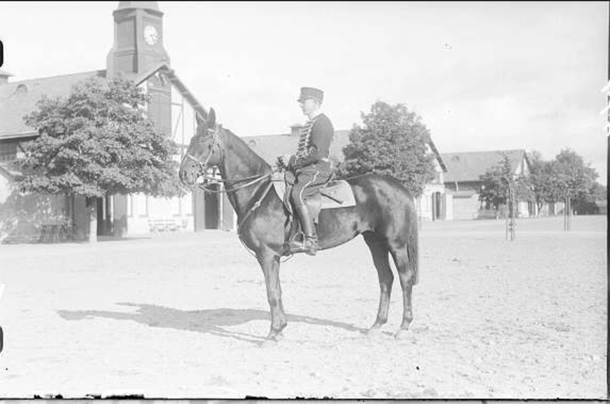 Livhusar på tilldelad stamhäst utanför skvadronstallet.