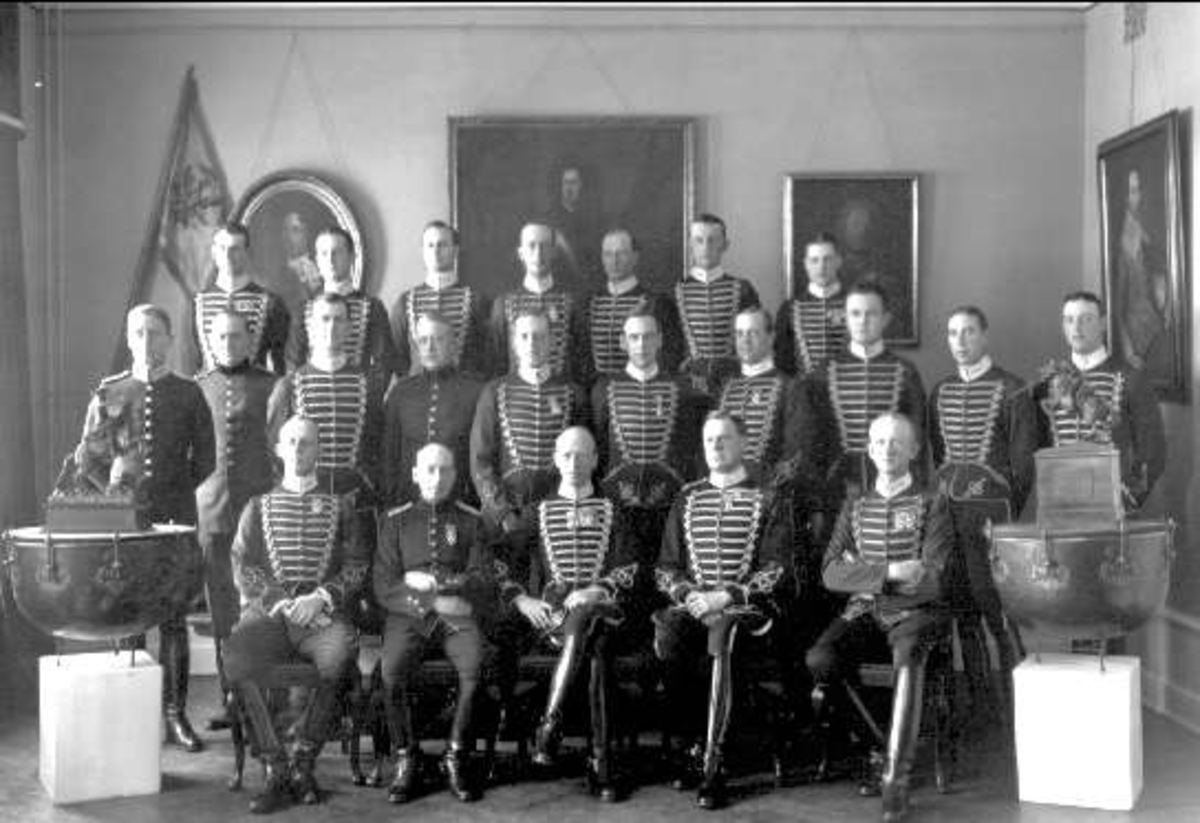 Titel: Främre raden vänster: Major Hampus Karlenberg, Reg.vetrinär Hellgren, Överste Henry Peyron, Major Sigfrid Gyllengahm., Ryttmästare Rolf Örn. Andra raden längst till höger Bengt Ljungkvist, sek-chef 1959-1967.