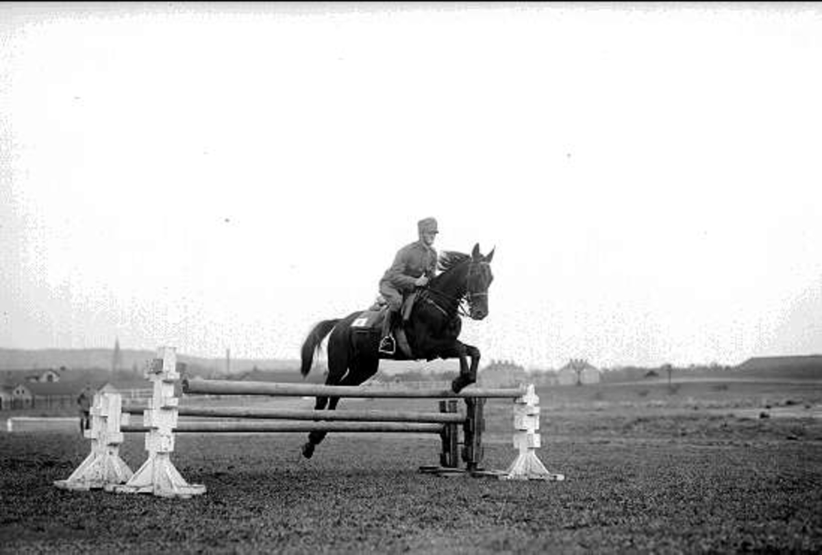 Hoppträning på fältet öster om kasern ("lusharpan"). 5.skvadronens stall skymtar i bakgrunden.