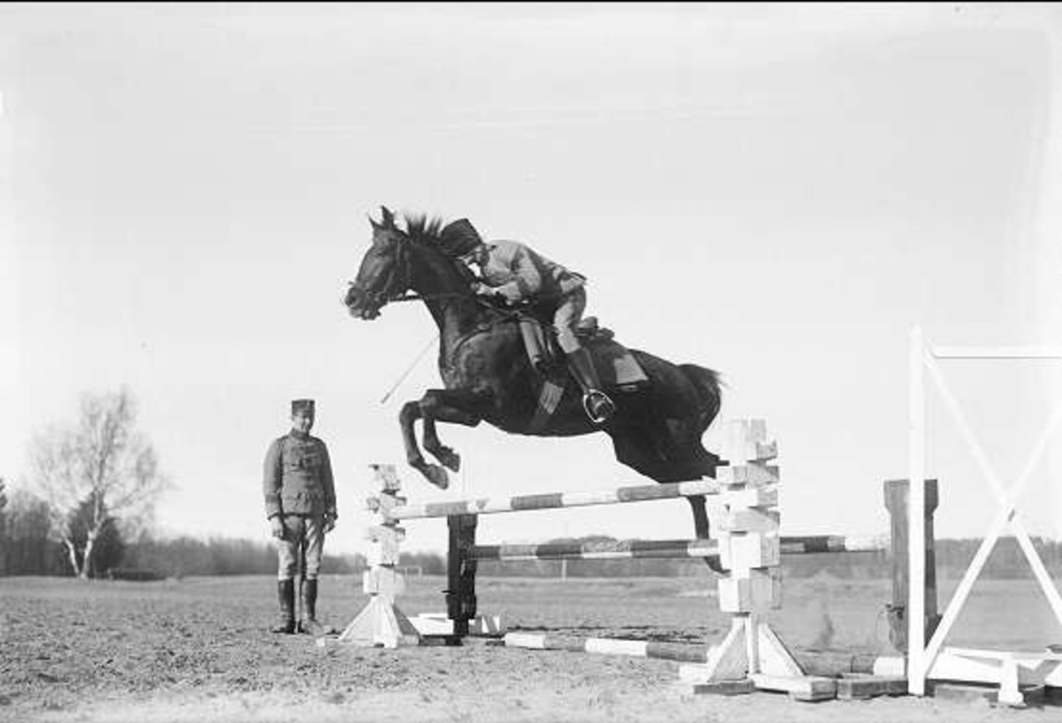 Träningshoppning på fältet söder K 3 kasern. Till vänster i bakgrunden " V-formade björken " och trumslagargropen.