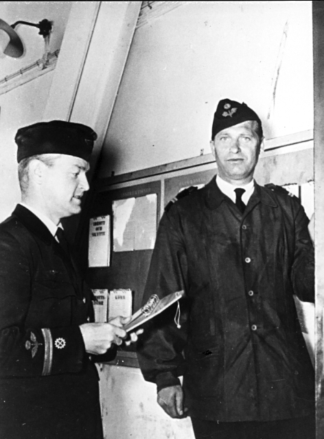 F6 Karlsborg 1954. Från vänster: Flygplanmästarna Rolff och Halldin. Albumet är en del av en donation från Karl-Axel Hansson, Karlsborg. Förteckning över hela donationen finns i albumet samt som Word-dokument.