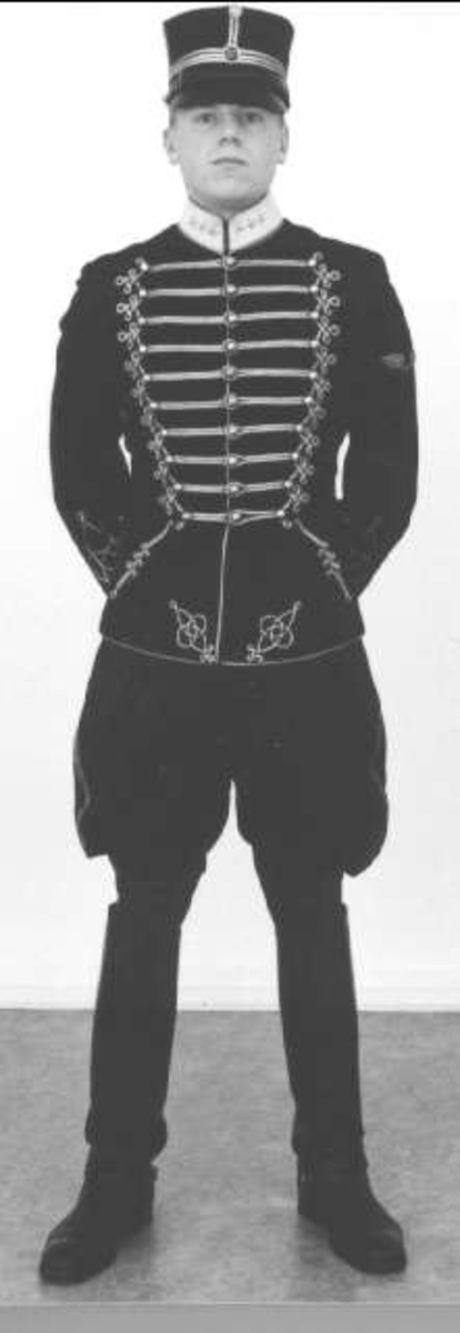 Uniform(dolma) m/1895 i förändringar hade skett 1846 och 1870. Mössan kallades husarmössa. Här officersuniform med revben i silver.