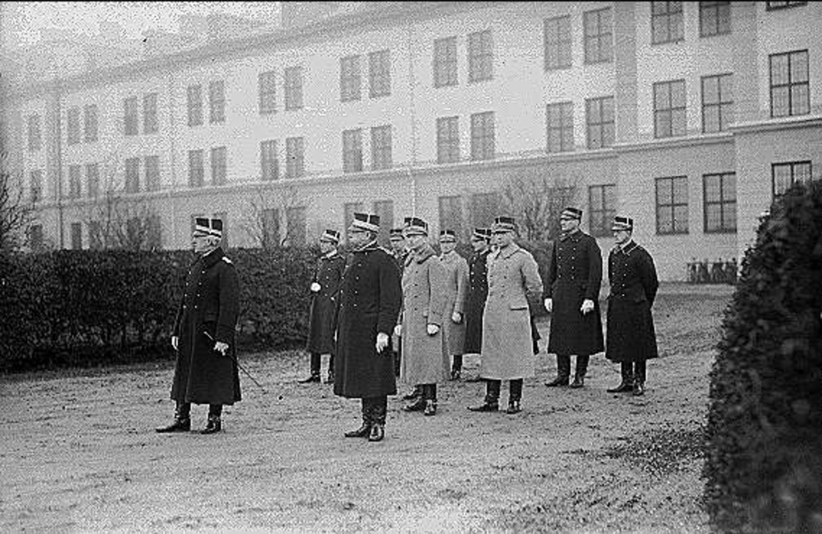 Kavalleriinspektören generallöjtnant Reinhold von Rosen. Sekundchefen överste C-E Knös och del av officerkåren framför valvet K 3. Förbimarsch efter 4. decemberhögtidlihet i soldathemmet.