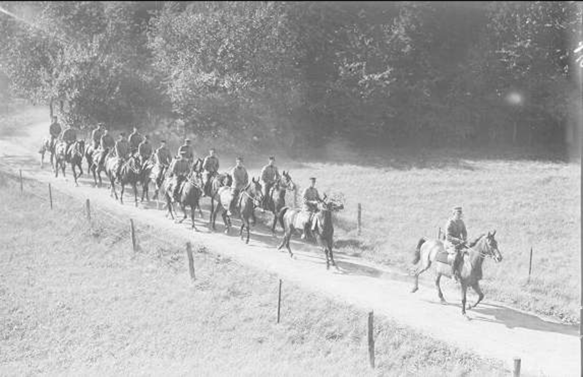 Del av regementet på marsch mot Hene skjutfält för att åse förevisningsskjutningar med 8,1 cm granatkastartropp. Ledare förevisningsövningarna: löjtn. Sven Littorin, granatkastartroppchef: serg. Ragnar Seipel.