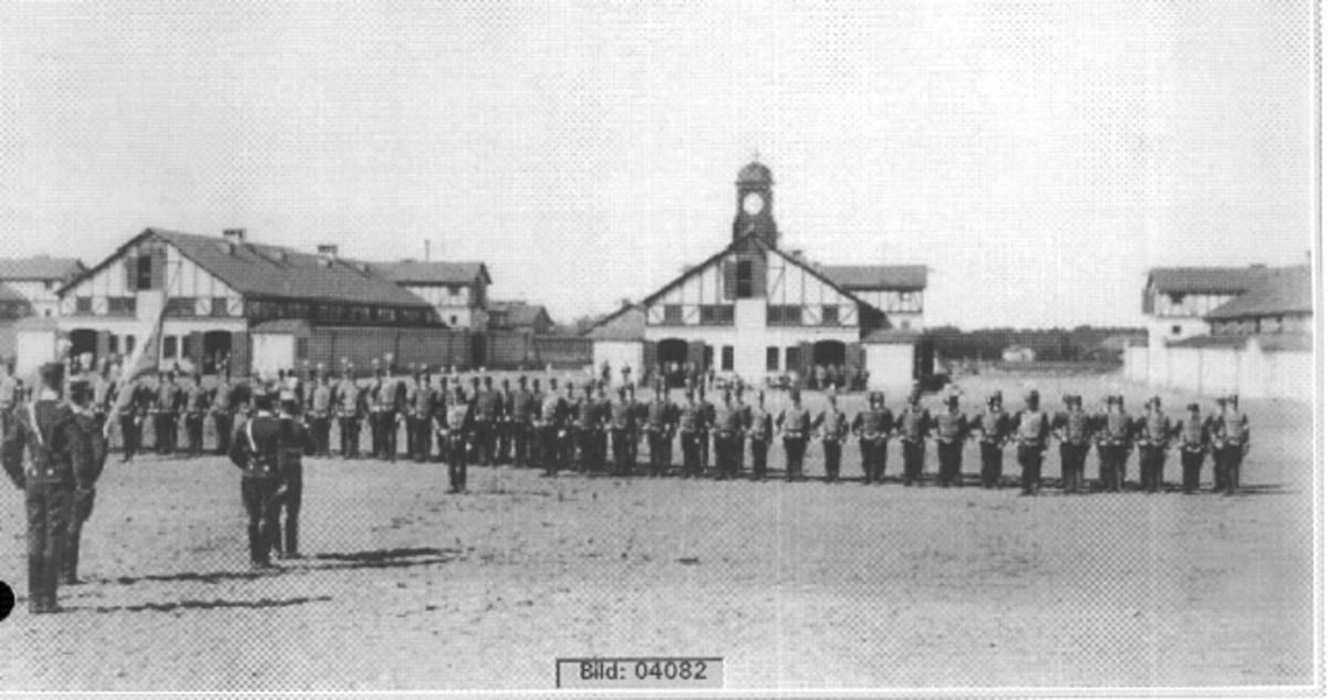 K3. Del av regementet uppställt på kaserngården i m/ä , paradavlämning till sekundchefen, som bakom sig har stabschef och standar. Bilden tagen vid seklets början. Allén mellan valvet och klockstallet ännu ej planterad. Allén planterades på överste Nyblaeus tid (1904-1912).