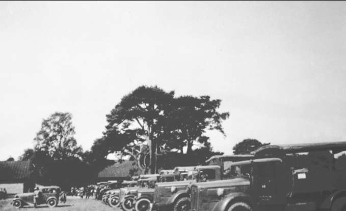 A 9, ett 7,5 cm lv kanonbatt. Uppställt i paddocken i slutet av 1930-talet. Modernare dragbilar (volvo). Förstoring 26 x 40 cm.