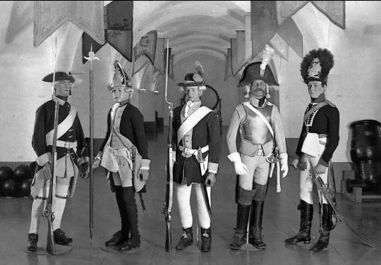 Vykort, Armémuseum Stockholm. Uniformer, från vänster Södermanlands regemente m/1756 menig, m/1765 underofficer, m/1779 menig, livregementets kyrassiärkår m/1795 menig, Västgöta lijnedragon m/1806 officer.