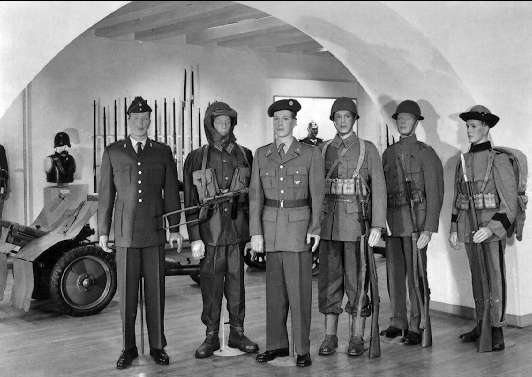 Vykort, Armémuseum Stockholm. Svenska uniformer, från höger m/1910, m/1923, m/1939, m/1952 fallskärmsjägare, m/1959 fältuniform, m/1960.