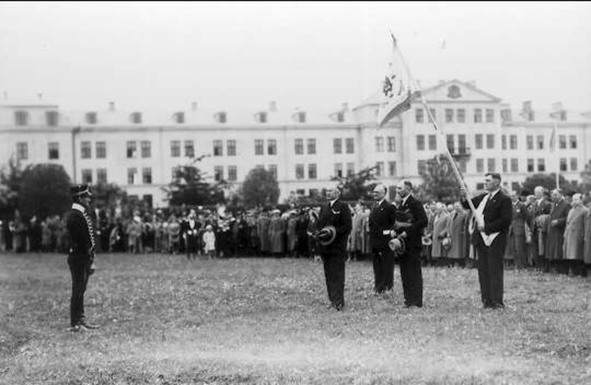 Uppställning på fältet söder K 3 kasern. Avlämning till sekundchefen överste K H Palmstierna. Framför Göteborgsavdelningen majoren i reserven (tidigare ryttm på stat) Wilhelm Odelberg.