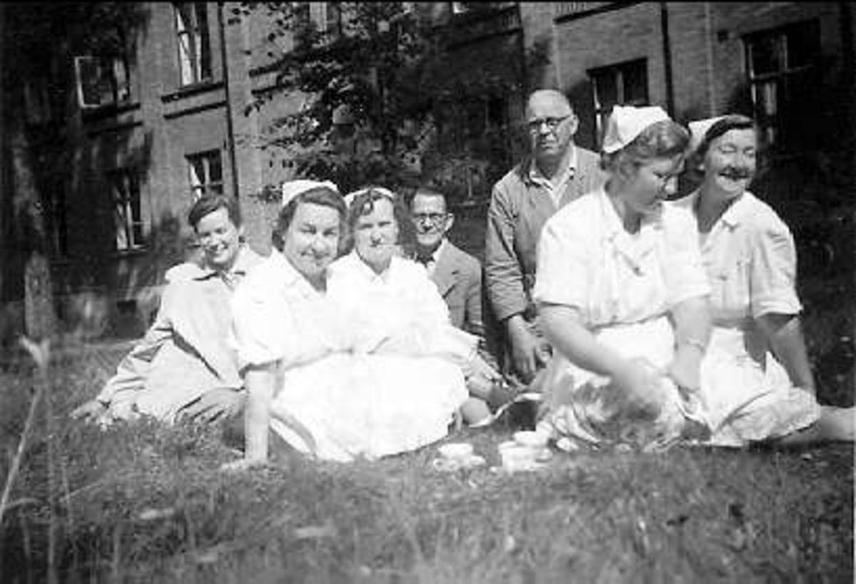 Garnisonssjukhuset Karlsborg, 1950-tal. Eftermiddagskaffe i sjukhusparken, Marianne Bernvik, Berta Pettersson, Karin Rosenberg, s-o nord sjukhusväbel, c mård, Mildred Stohlbin och Anna Stohlbin.